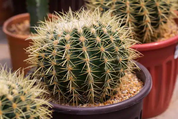 Se caracteriza por tener forma globosa, con la parte superior aplanada, y muchas espinas amarillas que lo recubren. Puede crecer hasta 1 metro de altura, pero dado que su crecimiento es muy lento, lo podrás tener en interiores para decorar espacios que reciban buena iluminación.