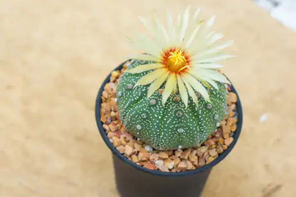 No ocupa mucho espacio en interiores y es uno de los tipos de cactus pequeños: crece de 10 a 20 centímetros de diámetro. Produce de una a ocho flores grandes, normalmente amarillas a blancas.