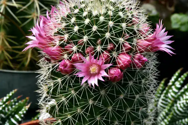 Las mamilarias, de género Mammillaria, son cactáceas muy llamativas que crecen en forma cilíndrica y desarrollando coronas de pequeñas flores en una amplia gama de colores. Además, están recubiertas por espinas, algunas llegando a parecer pelillos. Son una buena elección de cactus de interior con flores.