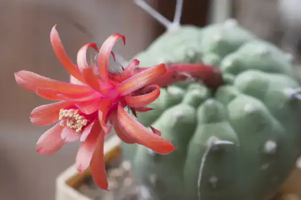 Esta cactácea es origina de Perú. Tiene forma esférica, de color verde grisáceo mate y sin brillo, con pocas espinas largas que lo rodean. Produce sobre ella una flor grande tubular de color rojo.